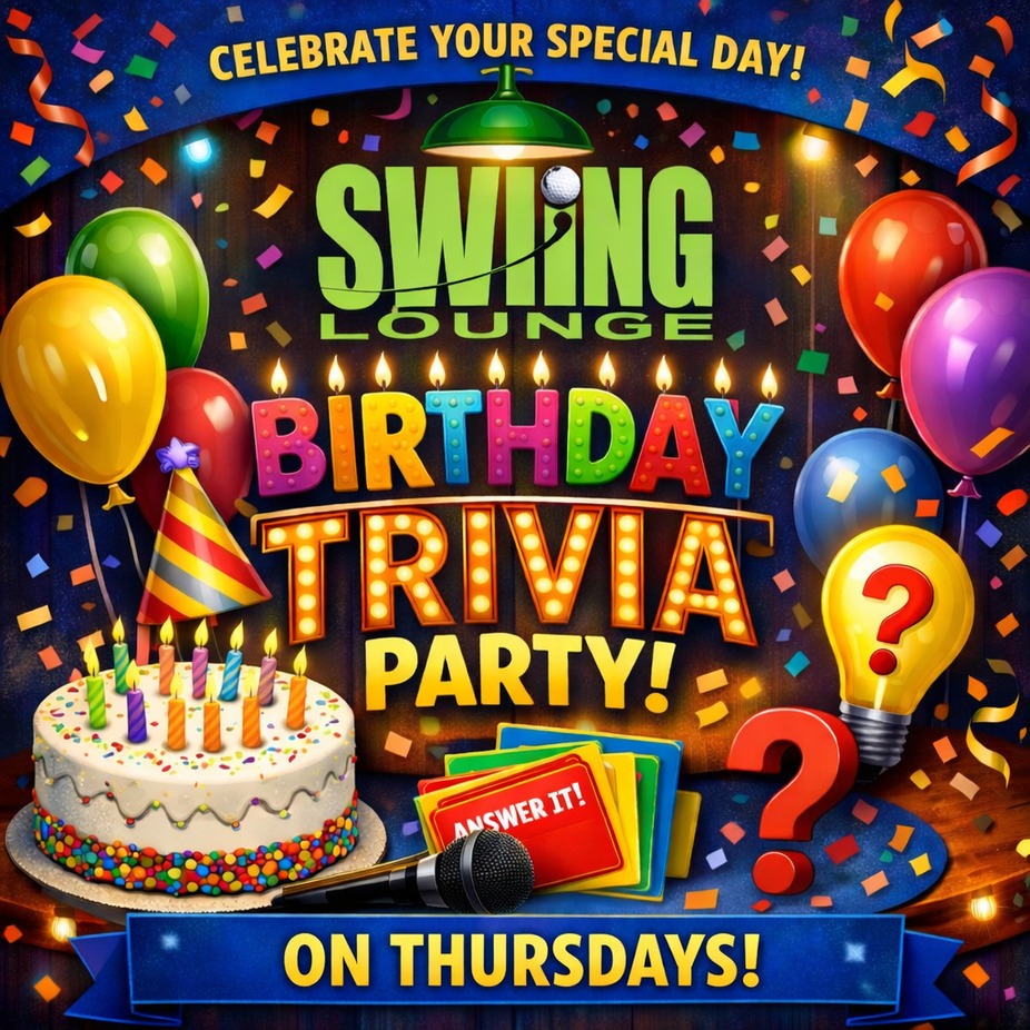 Trivia Night at Swing Lounge EVERY THURSDAY NIGHT! Join us every Thursday at 6PM for an exciting night of live trivia hosted by DJ Trivia! Grab your friends, form a team, and put your knowledge to the test across a variety of fun and challenging categories—from pop culture and sports to history, music, and more. Whether you're a trivia pro or just in it for the laughs, there’s something for everyone.
