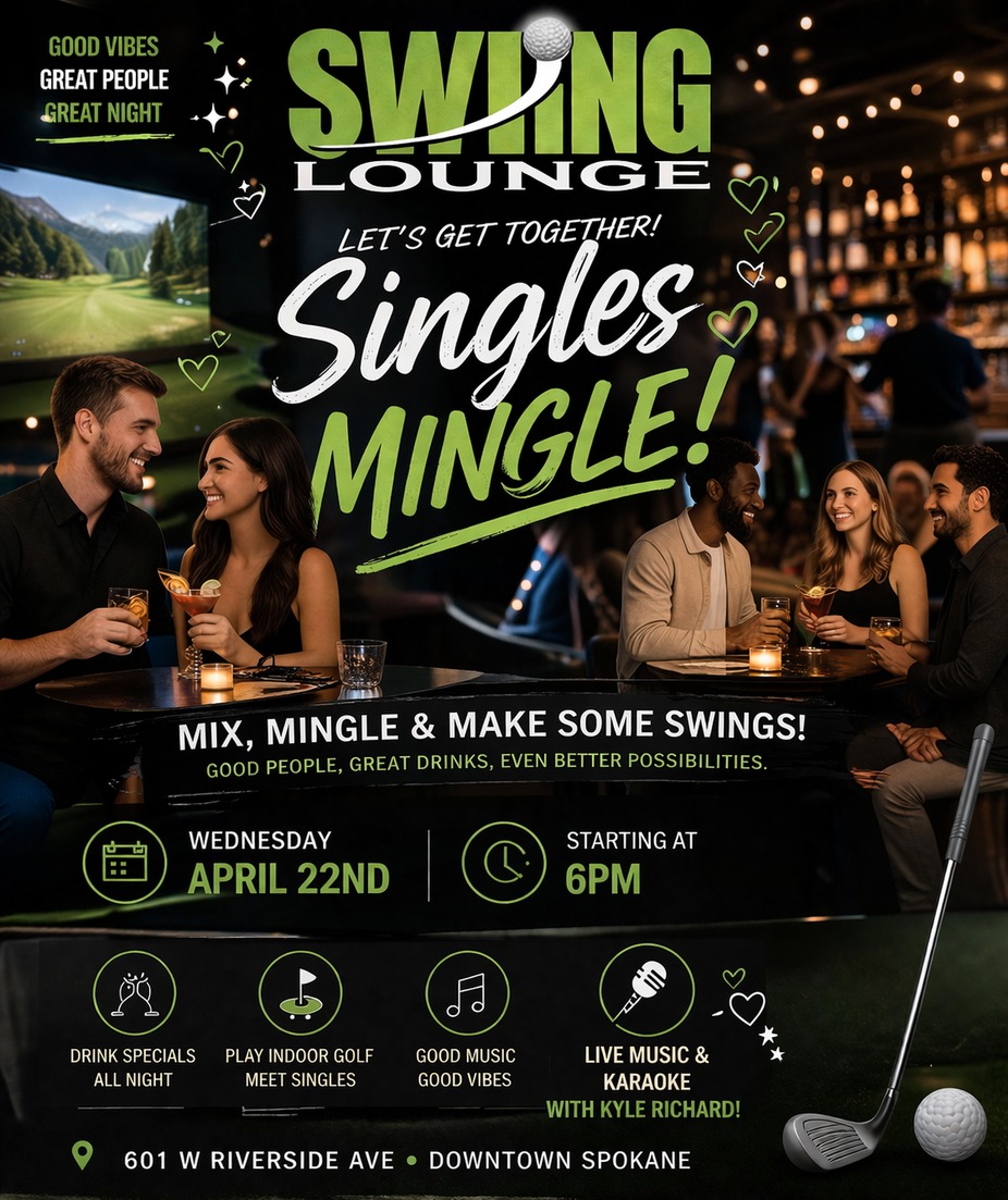 What to expect: Drink specials all night, Indoor golf bays open for play, Live music & karaoke with Kyle Richard, A lively, welcoming crowd of Spokane singles.